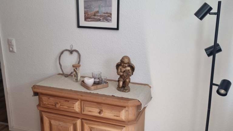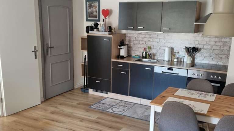 Die Ferienwohnung verfügt über eine voll ausgestattete Küche mit einem Kühlschrank und einer Kaffeemaschine. Weitere Verpflegungsmöglichkeiten sind nicht aufgeführt.