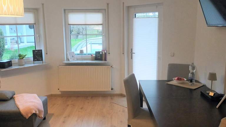Die Unterkunft Idyllische Lage im Süden Erfurts bietet eine ruhige Atmosphäre mit einem Garten, einem saisonalen Außenpool und Blick auf die Gartenlandschaft. Sie ist in einem Gebäude aus dem Jahr 1995 untergebracht und verfügt über eine Terrasse, die den Blick auf den Pool ermöglicht.