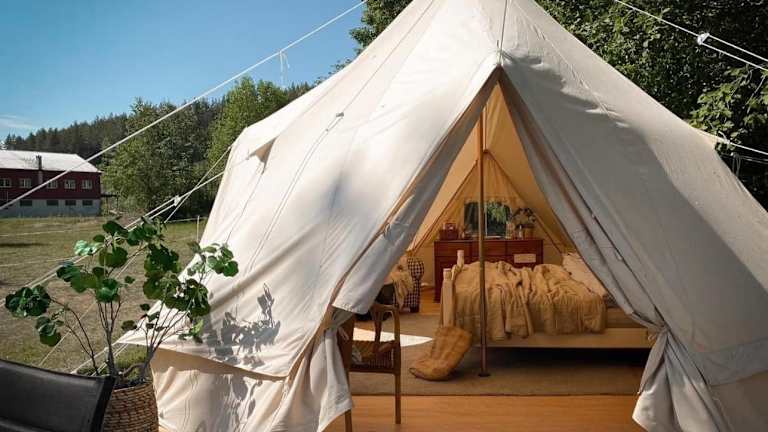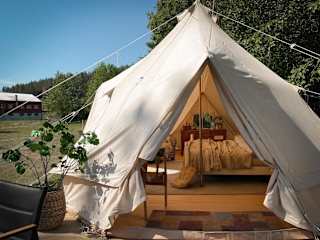 Erleben Sie einen idyllischen Glamping-Aufenthalt direkt am Fluss im Idyllisk glamping rett ved elven. Diese Unterkunft bietet Ihnen eine einzigartige Erfahrung mit Terrasse und Veranda, umgeben von einer schönen Naturkulisse. Genießen Sie die Ruhe und den Komfort dieser Unterkunft, die sich in der Nähe von Wrightegaarden und dem Telemark-Kanal befindet.