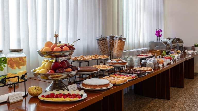Ein reichhaltiges Frühstücksbuffet wird täglich im großen Speisesaal serviert. Sie finden eine große Auswahl an süßen und herzhaften Speisen. Das Buffet bietet diätetische Produkte für Zöliakiekranke. Espresso und Cappuccino werden immer frisch zubereitet und am Tisch serviert.