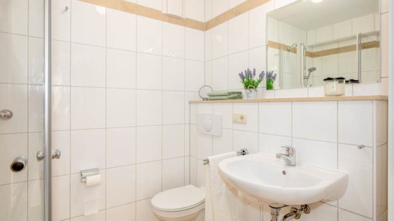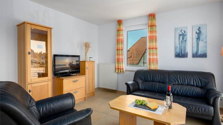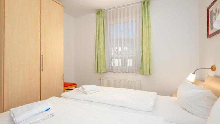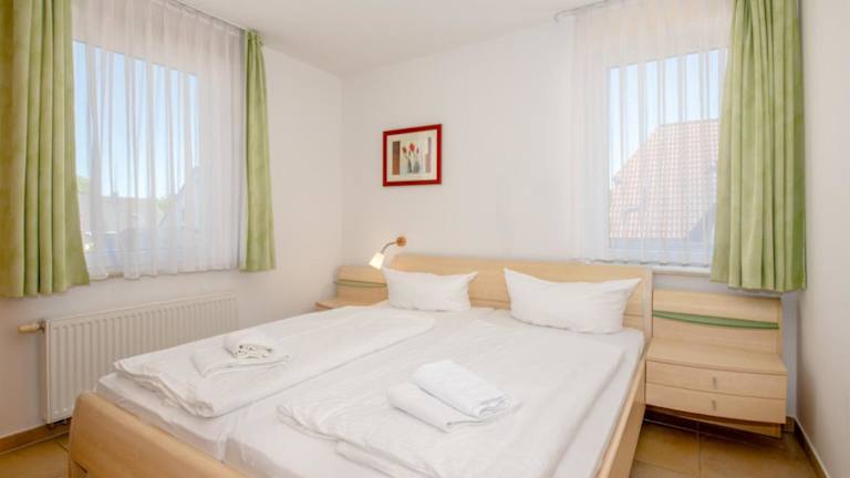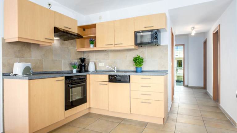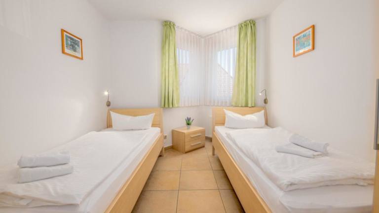 Die Ferienwohnung besteht aus zwei separaten Schlafzimmern und einer voll ausgestatteten Küchenzeile, die mit einem Kühlschrank und einem Geschirrspüler ausgestattet ist. Zudem steht ein Badezimmer zur Verfügung.
