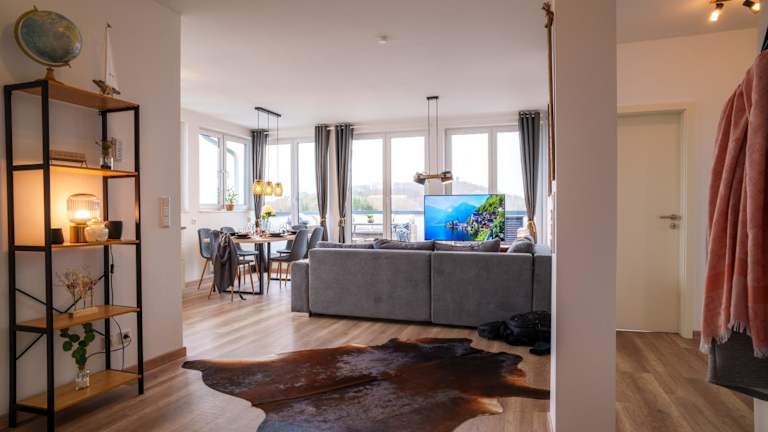 Die Ferienwohnung hat zwei Schlafzimmer und ein Wohnzimmer. Zur Ausstattung gehören ein Flachbild-TV, eine gut ausgestattete Küche mit Kühlschrank und Geschirrspüler sowie zwei Badezimmer mit Dusche. Handtücher und Bettwäsche werden bereitgestellt.