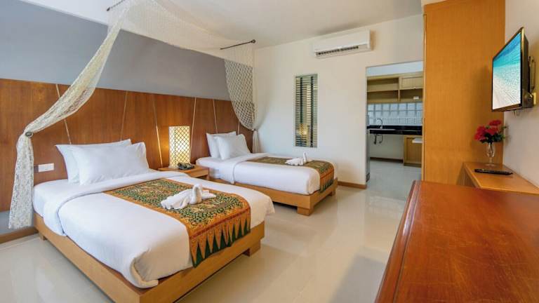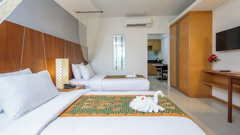 Die Zimmer sind mit einem Queensize-Bett ausgestattet und bieten Platz für Zustellbetten. Zur Ausstattung gehören WLAN (kostenlos), Nichtraucherzimmer, Klimaanlage, ein Flat-TV mit Satellitenkanälen, eine Küchenzeile, ein Essbereich sowie ein eigenes Badezimmer. Jede Wohneinheit hat außerdem einen Schreibtisch und einen Wasserkocher.