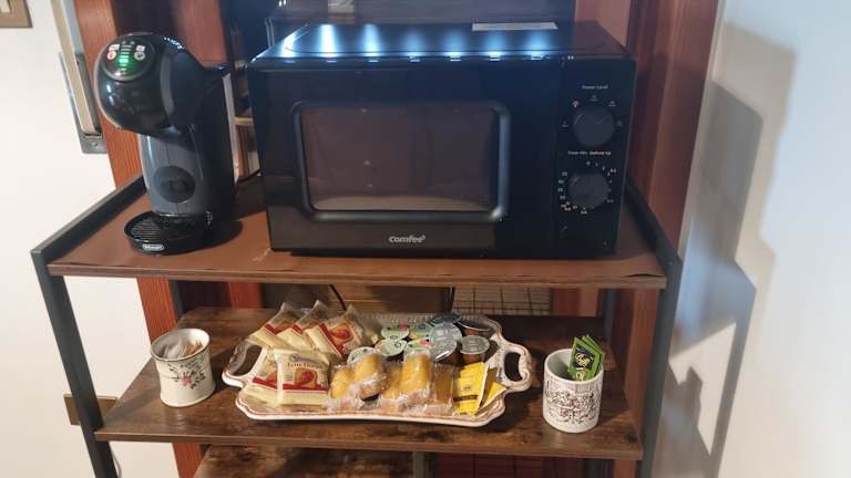 Eine voll ausgestattete Küche ist vorhanden, die mit einem Kühlschrank und einer Kaffeemaschine ausgestattet ist.