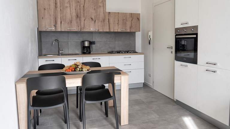 Die Ferienwohnung ist mit einer voll ausgestatteten Küche ausgestattet, die einen Kühlschrank und eine Kaffeemaschine umfasst.
