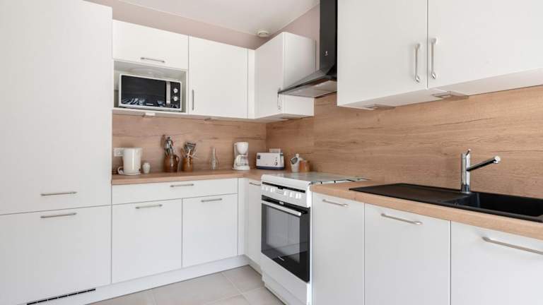 Die voll ausgestattete Küche umfasst einen Kühlschrank, Geschirrspüler, Waschmaschine, Ofen und Mikrowelle, aber es sind keine Informationen zu weiteren Verpflegungsmöglichkeiten angegeben.
