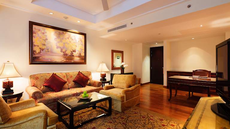 Das Indochine Palace Hotel bietet 53 Suiten, 24 Studios und 222 Doppelzimmer auf 17 Etagen. Jedes Zimmer verfügt über eine Klimaanlage und einen Balkon mit Blick auf die Stadt, den See oder den Pool. Zur Ausstattung gehören ein Kamin, ein Flachbild-TV und ein eigenes Badezimmer mit separater Badewanne und Dusche.