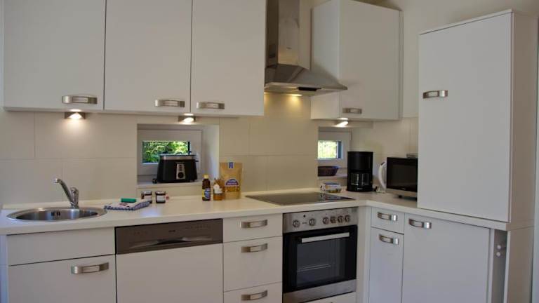 Das Ferienhaus verfügt über drei Schlafzimmer und eine Küchenzeile. Die Ausstattung umfasst einen Kühlschrank, einen Geschirrspüler sowie zwei Badezimmer mit Dusche, Haartrockner und Waschmaschine. Zu den Annehmlichkeiten gehören auch ein Kabel-TV, eine Terrasse und Gartenmöbel.