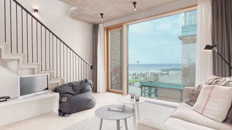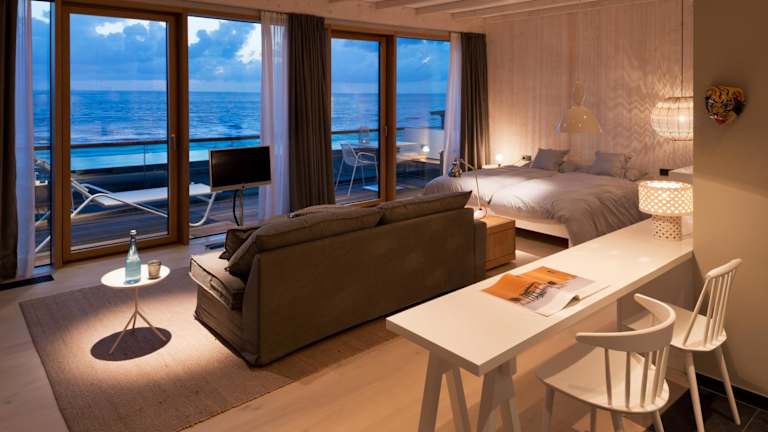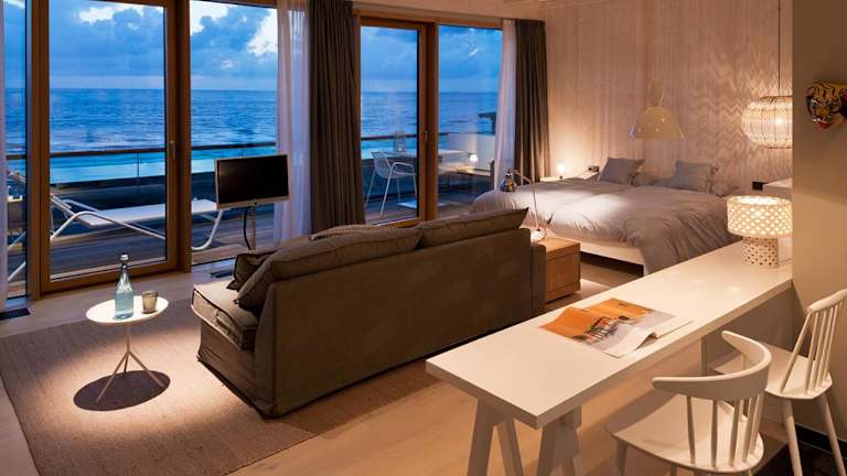 Direkt am Nordseestrand, nur 100 m vom Flutsaum entfernt liegt das Konzept-Hotel bestehend aus vier Häusern mit Stil. Beeindruckend sind die Massivholzbohlen, gedrechselte Hölzer, Natursteinböden aus belgischem Blaustein. Sie stehen im Kontrast zu Wandverkleidungen aus sägerauem Holz. Völlig begeistern die unvermuteten großzügigen Deckenhöhen in vielen Zimmern. Jedes Zimmer ist aufgrund der gewachsenen Historie einzigartig, überrascht aber im Komfort und Ausstattung mit hohen Ansprüchen.