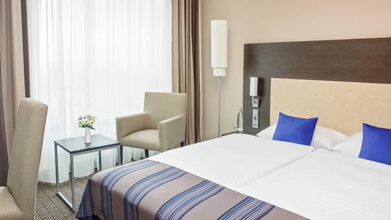 275 Zimmer, Klimaanlage, Minibar, Schreibtisch, Safe, Föhn, Kosmetikspiegel, WLAN bis zu einer Bandbreite von 256 kb/s inklusive, SAT-TV (mit kostenfreien Sky-Kanälen), Telefon mit Voicemail, Faxanschluss, behindertengerechtes Zimmer, Raucheretage