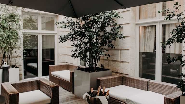 Das Hotel befindet sich gegenüber dem Grand Théâtre im Zentrum von Bordeaux, in der luxuriösen Einkaufs- und Fußgängerzone, bekannt als das Goldene Dreieck. Neben der guten Erreichbarkeit der Stadt bietet die Umgebung Zugang zu Weingütern, Golfplätzen, und auch die Skigebiete der Pyrenäen sind von hier aus erreichbar. Der Flughafen Bordeaux-Mérignac ist etwa 11 km entfernt und der Bahnhof befindet sich in ca. 50 m Entfernung.