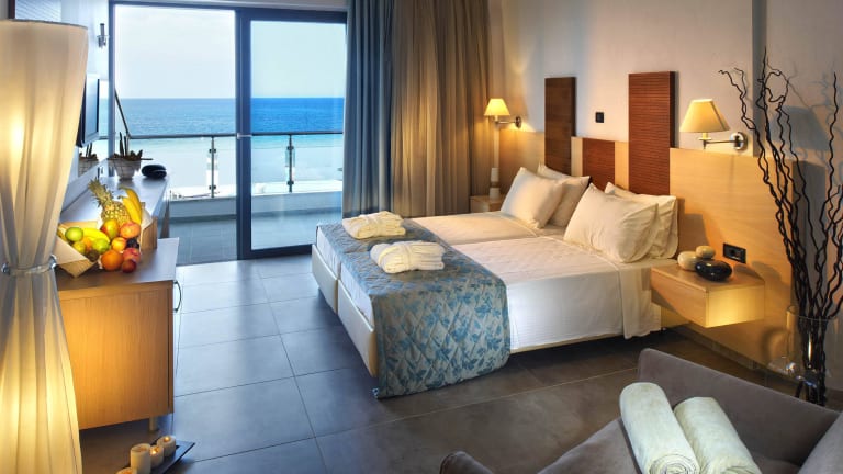 Die komfortablen, geräumigen Zimmer und Suiten mit modernem Dekor bieten Ruhe und Entspannung mit Blick auf die schöne Gartenanlage oder das Meer. Zur Verfügung stehen Standardzimmer (25m², mit Gartenblick, bis 3 Personen), Superior Zimmer (25m², Meerblick, bis 3 Personen), Junior Suiten (40m², Garten- oder Meerblick, bis 4 Personen) und Familienzimmer (45m², Garten- oder Meerblick, bis 4 Personen).