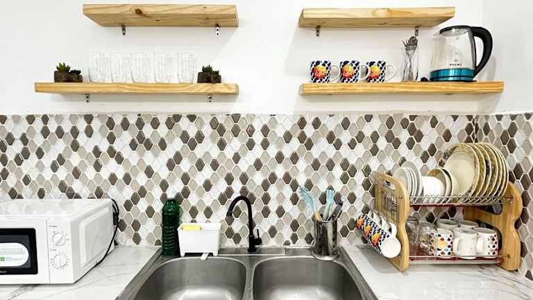 Essenslieferung in die Unterkunft ist möglich. Es gibt eine voll ausgestattete Küche mit Kühlschrank und Wasserkocher, was Selbstverpflegung ermöglicht.