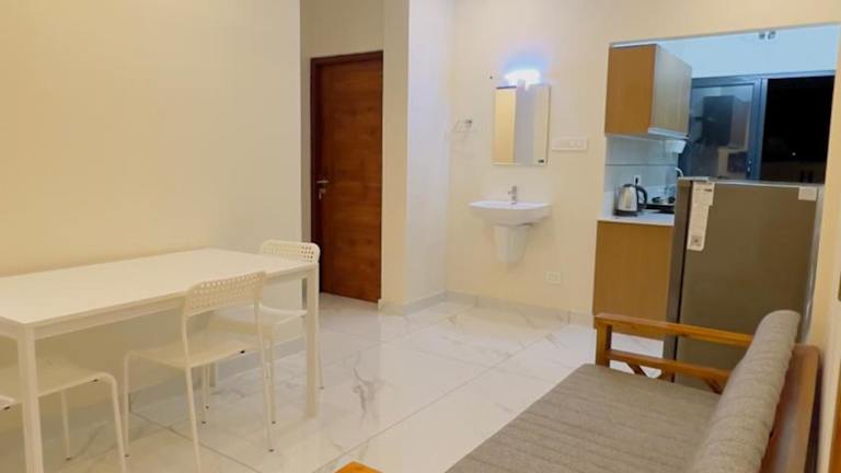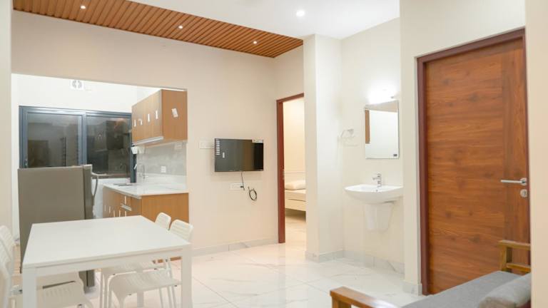 Die Zimmer sind mit einem Sitzbereich, einem Satelliten-Flachbild-TV und einer voll ausgestatteten Küche ausgestattet. Zu den Annehmlichkeiten gehören ein Kühlschrank, eine Herdplatte und ein eigenes Badezimmer mit einem Bidet sowie kostenlosen Pflegeprodukten. Ein weiteres voll ausgestattetes Badezimmer mit Dusche und Hausschuhen steht ebenfalls zur Verfügung.