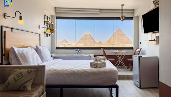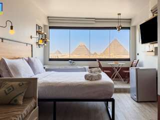 Die Unterkunft liegt 1,9 km von der Großen Sphinx von Gizeh entfernt und bietet einen Blick auf die Stadt. Die Pyramiden von Gizeh sind 4 km entfernt, während der Fernsehturm von Kairo 13 km entfernt ist. Der nächstgelegene Flughafen ist der Flughafen Kairo, der sich 29 km von der Unterkunft befindet.