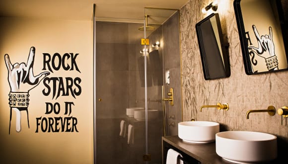 Ob als Rückzugsort, zum Schlafen oder um die Nacht zum Tag zu machen: Die 63 Zimmer und Suiten des JAMS Design-Hotel bieten Raum zum Ankommen und Relaxen. Sie vereinen modernen Komfort mit glamourösem Retro-Chic und sind mit allen Annehmlichkeiten ausgestattet, die eine Übernachtung zu einem Event werden lässt. Luxuriöse Komfortbetten – selbstverständlich samt hochwertiger Bettwäschekollektion und Pillow-Line-up mit hypoallergenen Kissen – versprechen süße Träume. Wer noch nicht müde ist, spielt einfach noch ein paar Platten und gönnt sich einen Drink aus der kostenlosen Minibar. Individuelle Wall-Art, warme Lichtelemente und raumbreite Fenster mit gepolsterten Sitzflächen sorgen für eine entspannte Wohlfühlatmosphäre. Und das alles auf den Spuren von Musiklegenden – die perfekte Symbiose aus Rock ‘n’ Roll und Ruhe.