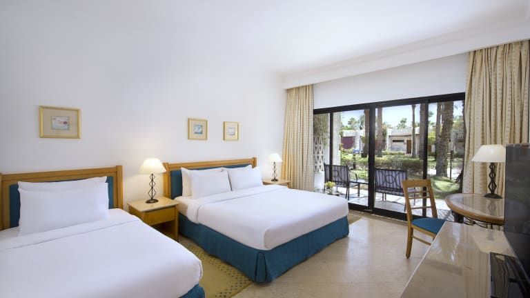 Guest rooms are designed for comfort and privacy and are decorated with style to accommodate all the needs of the guests. Rooms are tastefully appointed with rooms overlooking either colorful landscaped gardens, or one of the pools or the beach. Rooms Description Bungalow Standard Room: Garden view with either 1 Queen bed plus a sofa bed, OR Twin beds plus sofa bed, ground floor (7 Twin & 73 Queen). Can accommodate max 2 adults and one child. Superior pool view rooms: Pool view rooms with either 1 Queen bed & sofa bed, OR Twin beds and a sofa bed (25 Twin & 41 Queen). Can accommodate 3 adults, OR 2 adults and 2 children. The room can be either ground floor, or upper floor. Bungalow Front Row: Beach Front row first line (nearest to the beach) either 1 Queen bed plus a sofa bed, OR Twin beds plus a sofa bed, ground floor (6 Twin & 27 Queen).. Can accommodate max 2 adults and one child. Family room: Garden view with 1 Queen bed and Single bed ground floor. Can accommodate 3 adults. Family room Plus: Pool view with 1 Queen bed and Single bed ground floor. Can accommodate 3 adults, or 2 adults and one child. Queen Junior Suite: Garden View, Ground floor. Consists of one bedroom with one queen bed and one living room with one sofa bed (4 Queen bed). Can accommodate 3 adults, or 2 adults and one child. Beach The longest stretch of sandy beach in Naama Bay with direct access to the water The sandy beach is spacious and has a gently sloping shelf, which is perfect for families with children. With an abundance of sun beds, umbrellas and palm trees it is the perfect haven in which to relax and soak up the sun. It is suitable for snorkeling and other water sports and there is an abundance of marine life to be discovered at the house reef. The water sports kiosk located on the beach arranges aquatic activities such as pedals, sailing and also rents snorkeling equipment for the day.