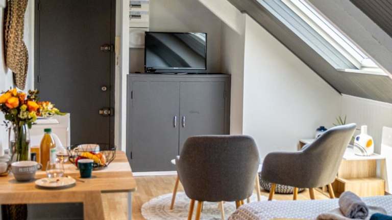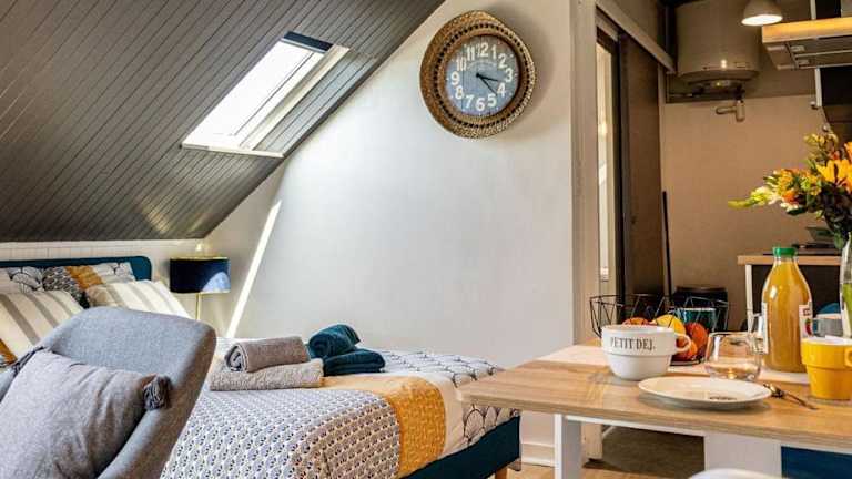 Das L'Odyssée - Studio entre Terre et Mer - Parking privé liegt weniger als 1 km vom Strand Plage du Val Andre entfernt und bietet somit eine ideale Lage für einen Strandurlaub. Der Strand Plage des Vallees ist ebenfalls nur 2,5 km entfernt. In der Nähe befinden sich auch das Museum für Kunst und Geschichte von Saint-Brieuc und die Kathedrale von Saint-Brieuc. Der Bahnhof Saint-Brieuc ist nur 26 km entfernt und der Flughafen Rennes erreichen Sie in 100 km Entfernung.