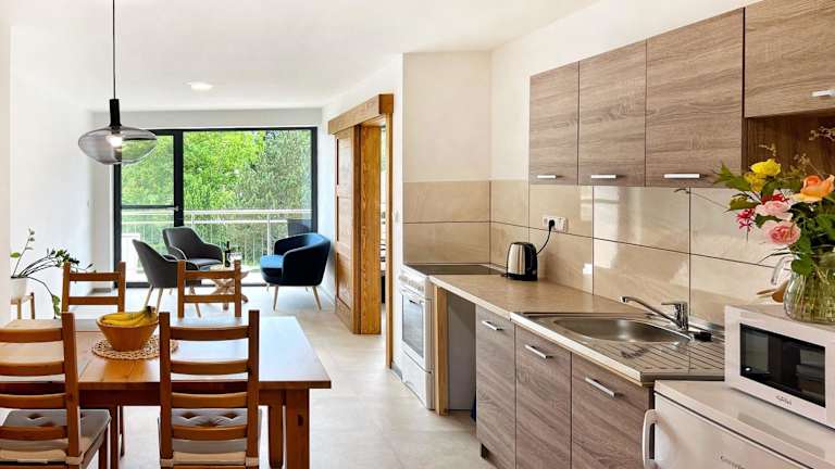 Die Ferienwohnung umfasst zwei separate Schlafzimmer, ein Wohnzimmer sowie eine voll ausgestattete Küche mit Kühlschrank und Ofen. Zudem steht ein Badezimmer zur Verfügung. Handtücher und Bettwäsche werden in der Unterkunft bereitgestellt.