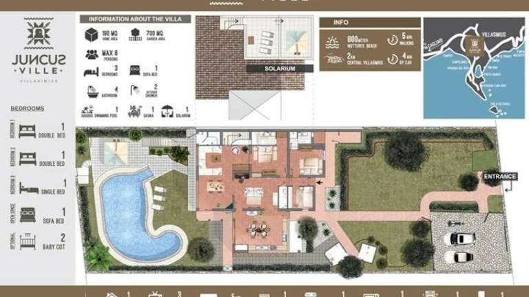 Die Unterkunft Juncus Ville befindet sich in Notteri, nur 600 m von der Spiaggia del Riso entfernt. Der Flughafen Cagliari-Elmas ist 63 km entfernt.