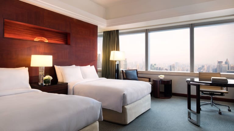 Die Zimmer im JW Marriott Shanghai at Tomorrow Square bieten einen atemberaubenden Blick auf die Stadt und sind mit modernen Annehmlichkeiten wie Flachbild-Kabel-TV, Kühlschrank und Safe ausgestattet. Die Badezimmer verfügen über eine Badewanne und eine separate Massagedusche.