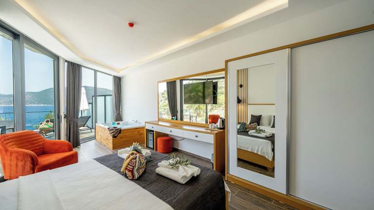 Die Zimmer im Kalkan Beach Park Hotel sind mit Klimaanlage, Kleiderschrank, Flachbild-TV und eigenem Badezimmer ausgestattet. Jedes Zimmer verfügt über Bettwäsche, Handtücher und eine Veranda oder einen Patio mit Meerblick. Einige Zimmer sind mit einem Balkon ausgestattet und bieten Poolblick. Des Weiteren verfügen alle Wohneinheiten über eine Minibar und einen Wasserkocher.