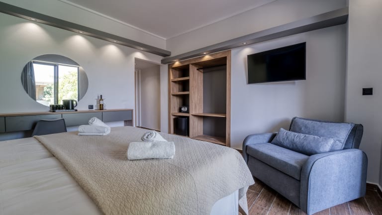 Die Zimmer sind klimatisiert und beheizt, bieten Meerblick von Balkon oder Terrasse und sind mit Doppel- oder Queensize-Betten ausgestattet. Kinderbetten können bereitgestellt werden. Zur Zimmerausstattung gehören ein Safe, eine Minibar, ein Schreibtisch, ein Minikühlschrank, ein Bügelset, ein Telefon, ein TV-Gerät und kostenloses WiFi. Die Badezimmer sind mit Duschen, Haartrockner, Kosmetikspiegel, Bademänteln und Telefonen ausgestattet. Das Hotel bietet Nichtraucherzimmer.