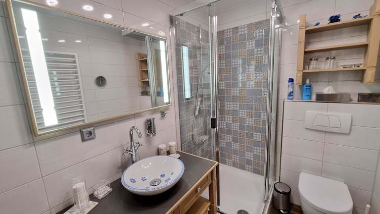 Die Ferienwohnung umfasst zwei Schlafzimmer und ein Wohnzimmer. Eine voll ausgestattete Küchenzeile, die mit einem Kühlschrank und einer Kaffeemaschine ausgestattet ist, sowie ein Badezimmer mit einer Dusche sind vorhanden. Gegen Aufpreis können Handtücher und Bettwäsche bereitgestellt werden.