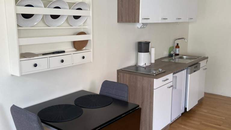 Die Ferienwohnung umfasst ein Schlafzimmer sowie eine Küche, die mit einem Kühlschrank, einem Geschirrspüler und einer Kaffeemaschine ausgestattet ist. Handtücher und Bettwäsche können gegen einen Aufpreis zur Verfügung gestellt werden, sind aber nicht im Zimmerpreis enthalten.