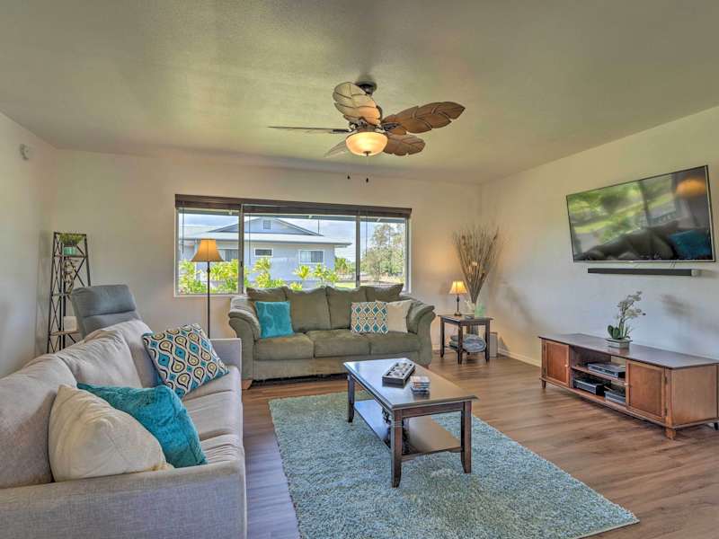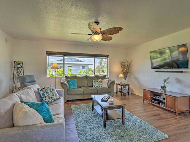 Das Ferienhaus im Keaau Home - 34 Mi to Volcanoes NP, near Hilo bietet Ihnen drei Schlafzimmer und eine komfortable Wohnzimmer mit Kabel-TV. Die voll ausgestattete Küche verfügt über einen Kühlschrank und einen Geschirrspüler, so dass Sie Ihre Mahlzeiten bequem zubereiten können. Das Ferienhaus verfügt auch über drei Badezimmer mit Duschen. Handtücher und Bettwäsche werden zur Verfügung gestellt, um Ihren Aufenthalt so angenehm wie möglich zu gestalten.