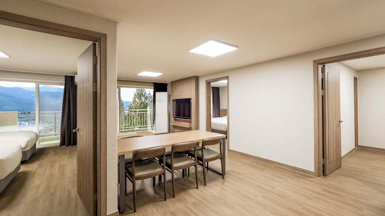 Die Zimmer sind komfortabel eingerichtet und verfügen über eine Klimaanlage, Heizung sowie einen Balkon oder eine Terrasse mit Bergblick. Ausstattungsmerkmale sind Doppelbetten, Queensize-Betten oder Kingsize-Betten, eine Kochnische mit Kühlschrank, Telefon, Sat-TV und kostenfreies WLAN. Hausschuhe sind ebenfalls vorhanden. Die Badezimmer sind mit Dusche und Haartrockner ausgestattet, und es werden sowohl Familien- als auch Nichtraucherzimmer angeboten.