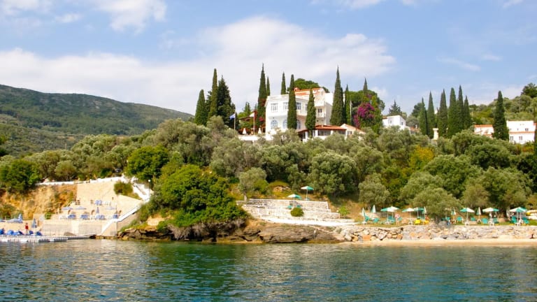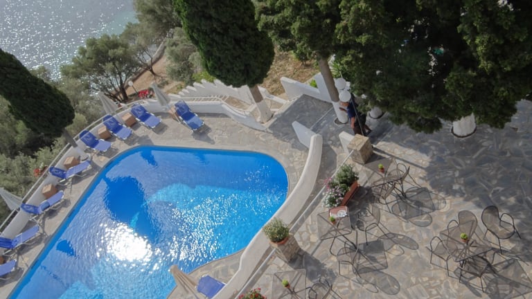 Das Hotel liegt ruhig und in grüner Umgebung, etwa 50 m von der kleinen Kiesbucht entfernt, die über Treppen erreichbar ist. Samos-Stadt befindet sich in einer Entfernung von ca. 9 km. Die Unterkunft bietet eine Lage in Hanglage oberhalb des Meeres, umgeben von einer Landschaft mit Olivenbäumen und Zypressen.