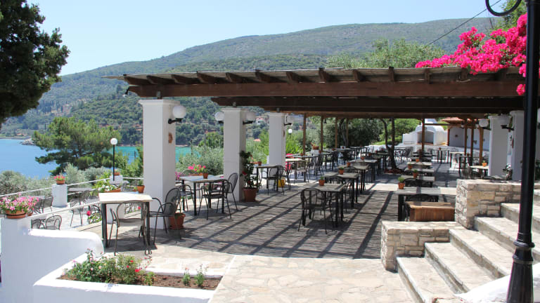 Die Verpflegungsoptionen umfassen Halbpension mit Frühstück und Abendessen, wobei das Frühstück täglich von 07:30 Uhr bis 10:00 Uhr und das Abendessen von 18:30 Uhr bis 21:00 Uhr als gesetztes 3-Gänge-Menü serviert wird. Snacks sind täglich gegen Gebühr erhältlich. Das Restaurant bietet eine griechische und mediterrane Küche, die auf den Terrassen genossen werden kann. Zudem gibt es eine Lobby- und Poolbar, die eine Auswahl an Snacks, Getränken und Cocktails anbietet.