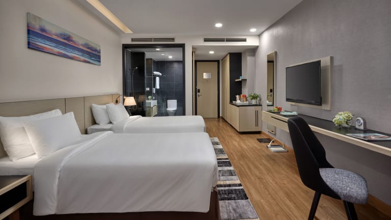 Die Zimmer sind klimatisiert und bieten Einrichtungen wie einen Schreibtisch, einen Wasserkocher, einen Safe, einen Flachbild-TV und ein eigenes Badezimmer mit einem Bidet. Jedes Zimmer ist mit einem Kleiderschrank ausgestattet.