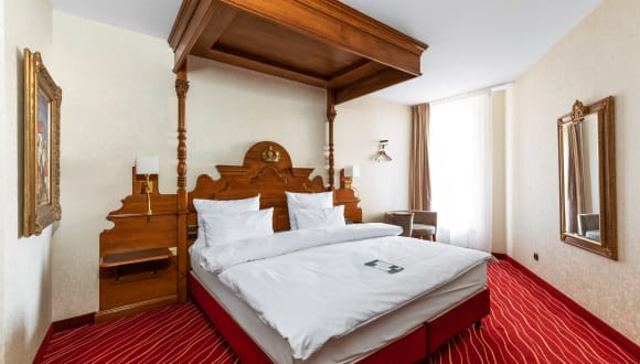 This grand hotel is just a 3-minute walk from Munich Central Station. The elegant rooms come with a four-poster bed, a Nespresso coffee machine and a flat-screen TV. WiFi is available free of charge. Check-in and check-out takes place stuffless via a kiosk in the hotel lobby. Please note that cash payment is not possible. The 4-star King's Hotel First serves a rich breakfast buffet. Our coworking coffee is ideal for the right vibe during your working hours. Modern workspaces later transform into a fancy bar. You can hold larger business meetings in our conference room with a view over the rooftops of Munich. Each room at King's Hotel is air-conditioned and features floor-to-ceiling windows and high-quality wooden furniture. The modern bathrooms are equipped with heated towel rails.