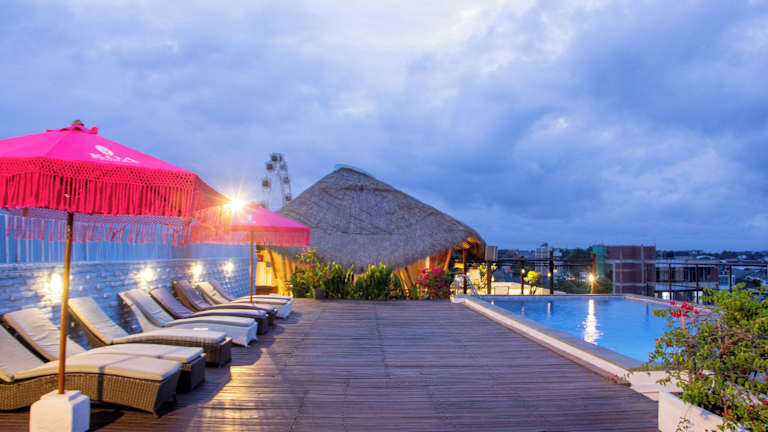 Das Koa D Surfer Hotel in Canggu bietet gemütliche Unterkünfte in einer schönen Bambusarchitektur und einem stilvollen Wanddekor. Genießen Sie die entspannte Atmosphäre und das einzigartige Strandgefühl auf dem Dach mit einem Pool und echtem Sand. Das Hotel verfügt außerdem über ein Restaurant und ein Geschäft für Surfausrüstung. Die Zimmer sind komfortabel eingerichtet und einige bieten einen Balkon mit Blick auf das Reisfeld oder die Straße. Das Hotel bietet außerdem Parkplätze, Aufbewahrungsmöglichkeiten für Surfbretter und einen Flughafentransfer gegen Aufpreis.