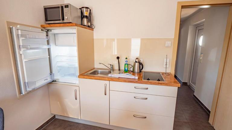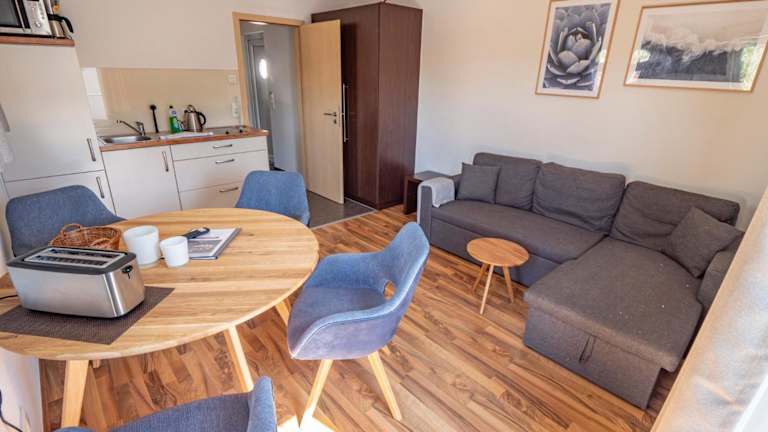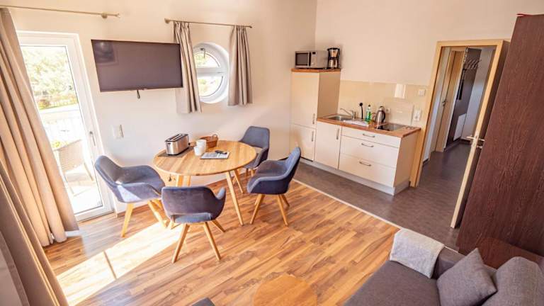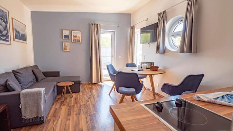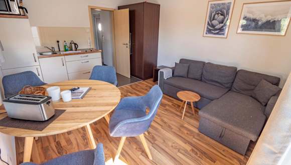 Die Ferienwohnung Kölpinsee 09 umfasst ein Schlafzimmer und ein Wohnzimmer, das mit einem Satelliten-Flachbild-TV ausgestattet ist. Die Küchenzeile ist voll ausgestattet und verfügt über einen Kühlschrank. Handtücher und Bettwäsche werden zur Verfügung gestellt.