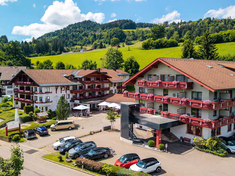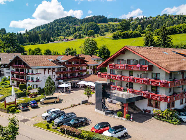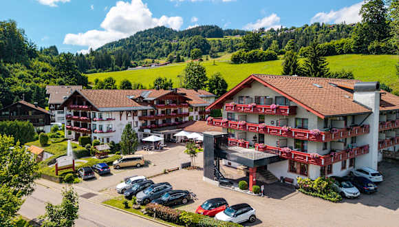 Das Königshof Hotel Resort liegt unterhalb Oberstaufens im Ortsteil Weissach. Das Hotel bietet einen traumhaften Blick Richtung Süden mit der Nagelfluhkette und dem Hochgrat. Unweit des Hotel, ca. 200m entfernt, befindet sich die Bushaltestelle. Die Nutzung der öffentlichen Verkehrsmittel ist im Rahmen der Oberstaufen Card kostenfrei.
