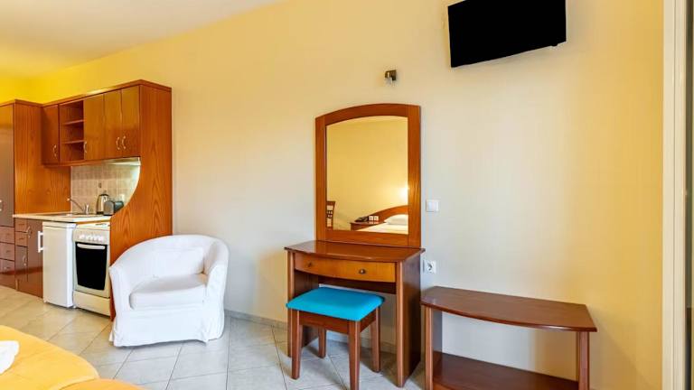 Die Zimmer im Kosmos Hotel sind klimatisiert und verfügen über einen Balkon, auf dem Sie die frische Meeresbrise genießen können. Die Unterkünfte sind komfortabel eingerichtet und bieten kostenfreies WLAN. Die Küche ist mit einem Kühlschrank, einem Backofen, einem Kochfeld und einem Wasserkocher ausgestattet, so dass Sie Ihre eigenen Mahlzeiten zubereiten können.