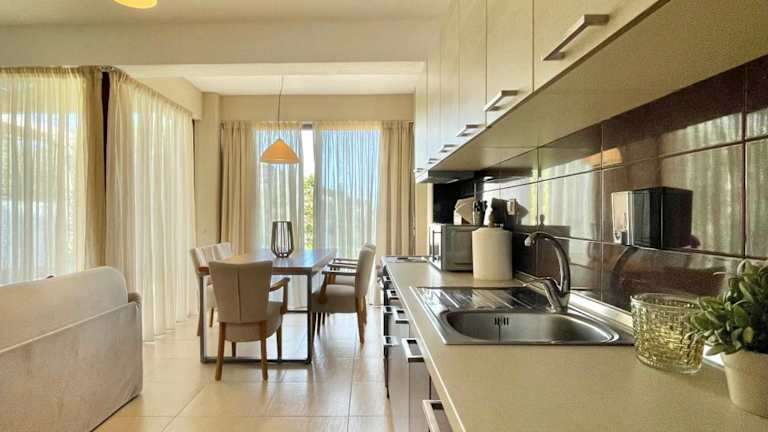 Die Unterkünfte sind mit einer voll ausgestatteten Küche ausgestattet, die Kühlschrank, Backofen, Mikrowelle, Toaster und Wasserkocher umfasst. Somit können Gäste ihre eigenen Mahlzeiten zubereiten. In der Umgebung von Agia Paraskevi finden sich zudem Bars und Tavernen am Meer.