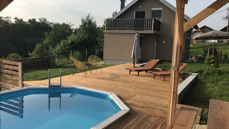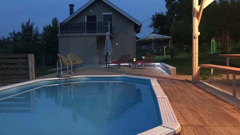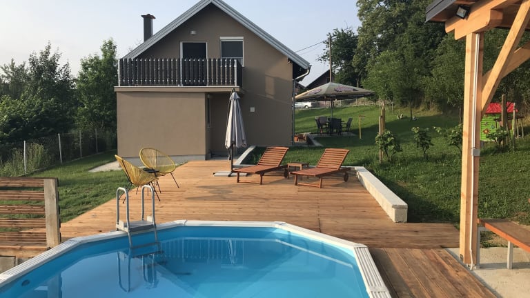 Entdecken Sie das Kuća za odmor David-privatni bazen in Donja Zelina, Zagreb, und genießen Sie einen erholsamen Aufenthalt in diesem Ferienhaus mit eigenem Pool und Garten. Das Haus bietet komfortable Zimmer, eine voll ausgestattete Küche und kostenfreies WLAN. Entspannen Sie am Außenpool oder erkunden Sie die Umgebung mit dem Fahrrad. Der Zoo Zagreb und der Maksimir-Park sind nur eine kurze Autofahrt entfernt.