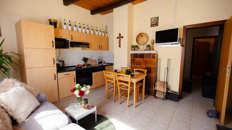 Die Ferienwohnung verfügt über 1 Schlafzimmer, ein Wohnzimmer und eine voll ausgestattete Küche mit Kühlschrank und Wasserkocher. Des Weiteren gibt es ein Badezimmer mit Badewanne und kostenlosen Pflegeprodukten. Handtücher und Bettwäsche werden bereitgestellt.