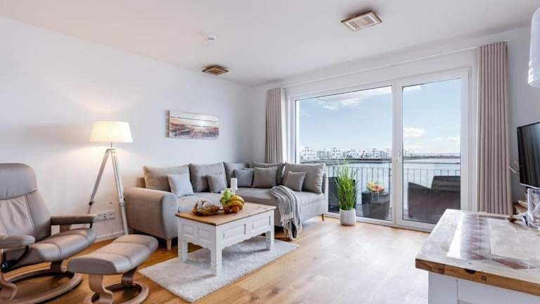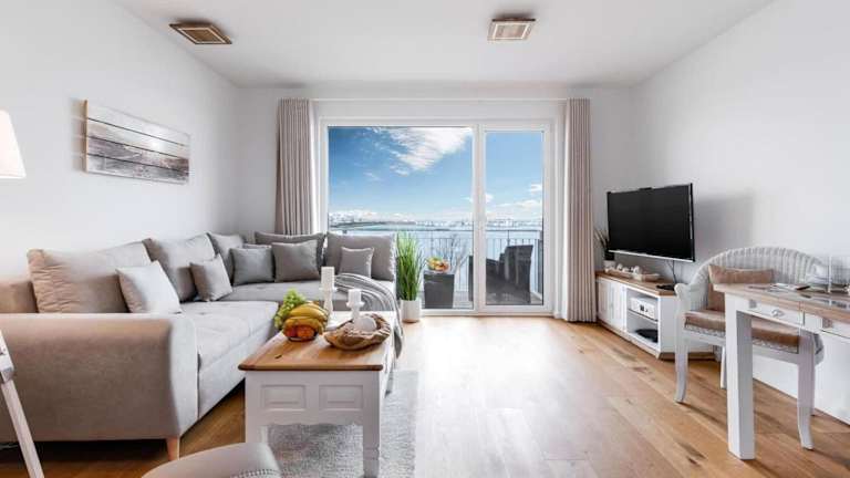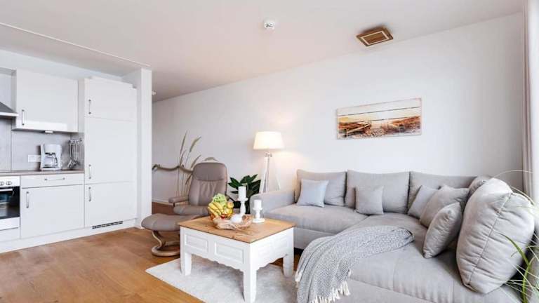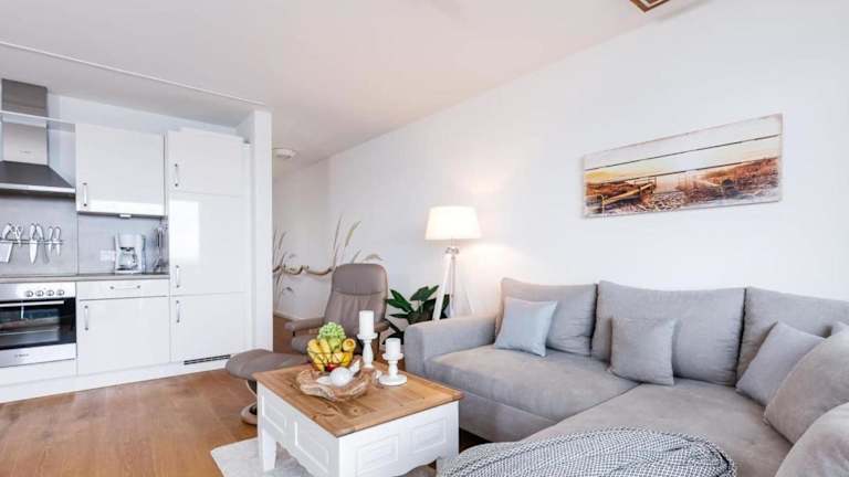 Die Ferienwohnung verfügt über ein Schlafzimmer, ein Wohnzimmer und eine gut ausgestattete Küche mit Kühlschrank und Geschirrspüler. Ein Fernseher ist ebenfalls vorhanden.