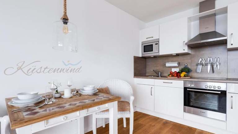 Die Unterkunft Küstenwind bietet eine Ferienwohnung mit Terrasse, einem Schlafzimmer, einem Wohnzimmer sowie einer gut ausgestatteten Küche, die mit einem Kühlschrank und einem Geschirrspüler ausgestattet ist. Die gesamte Unterkunft verfügt über kostenloses WLAN und es gibt eine Bar sowie ein Restaurant mit Meerblick.