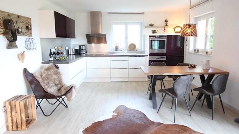 Die Wohneinheiten sind mit einer voll ausgestatteten Küche ausgestattet, die einen Esstisch, Kühlschrank, Geschirrspüler, Ofen, Kaffeemaschine und Wasserkocher umfasst. Die Selbstversorger-Küche ermöglicht eine individuelle Gestaltung der Verpflegung.