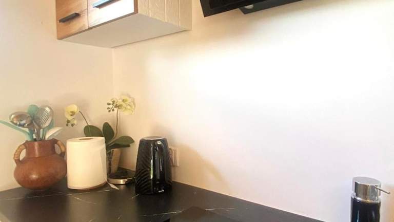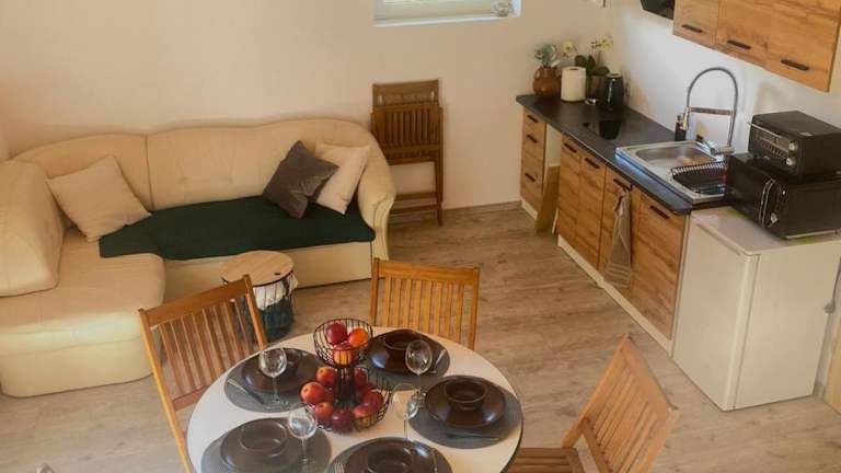 Die Ferienwohnung besteht aus einem Schlafzimmer und einem Wohnzimmer sowie einer voll ausgestatteten Küchenzeile, die mit Kühlschrank und Wasserkocher ausgestattet ist. Ein Badezimmer mit Dusche und Haartrockner ist ebenfalls vorhanden. Außerdem werden Handtücher und Bettwäsche bereitgestellt. Die Unterkunft ist klimatisiert.