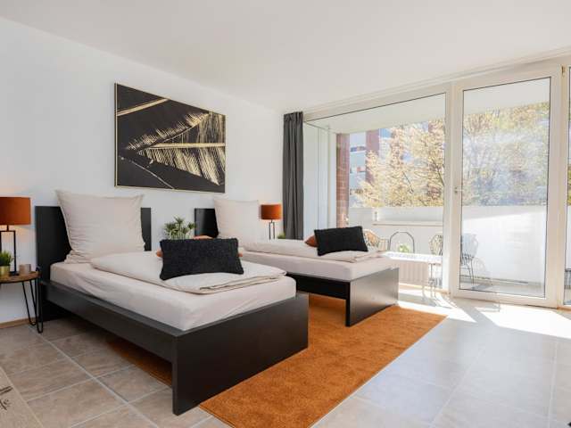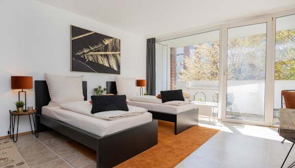 In unmittelbarer Nähe des Apartments finden Sie verschiedene Freizeitaktivitäten und Sehenswürdigkeiten. Besuchen Sie die Kaiser-Friedrich-Halle für kulturelle Veranstaltungen oder erkunden Sie den Borussia Park für Fußballfans. Die Rheinuferpromenade bietet Möglichkeiten für Spaziergänge und Radtouren entlang des Rheins.