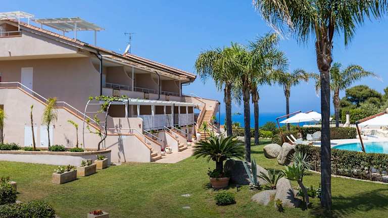 Das L' Arcobaleno Resort in Capo Vaticano bietet Ihnen einen traumhaften Aufenthalt an der Tyrrhenischen Küste Kalabriens. Mit herrlichem Blick auf die Äolischen Inseln und die Meerenge von Messina können Sie sich in diesem mediterran gestalteten Resort entspannen. Die Apartments im mediterranen Stil sind mit modernem Komfort ausgestattet und verfügen über eine Küchenzeile, ein eigenes Bad und einen Balkon. Der von Palmen umgebene Pool lädt zum Verweilen ein und im großen Garten können Sie die Ruhe genießen. Ein kostenloser Shuttleservice bringt Sie zum Strand und auch ein Whirlpool sowie ein Grillplatz stehen Ihnen zur Verfügung. Das Resort bietet auch einen Shuttleservice zum Flughafen Lamezia Terme an.