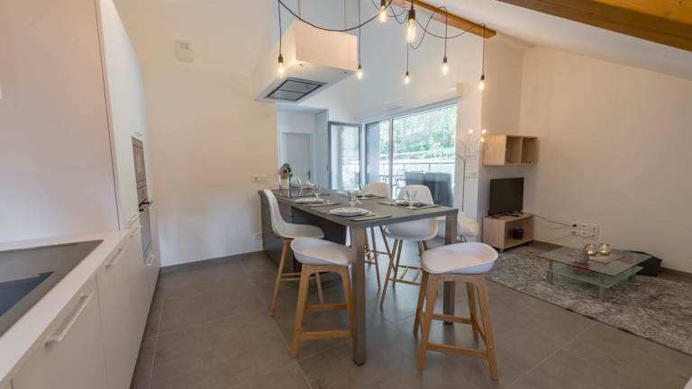 Das Appartement verfügt über zwei Schlafzimmer und ein Badezimmer. Zur Ausstattung zählen Bettwäsche, Handtücher, ein TV sowie eine voll ausgestattete Küche. Zusätzlich gibt es eine Terrasse mit Blick auf die Berge.