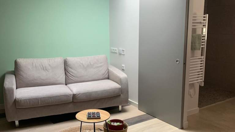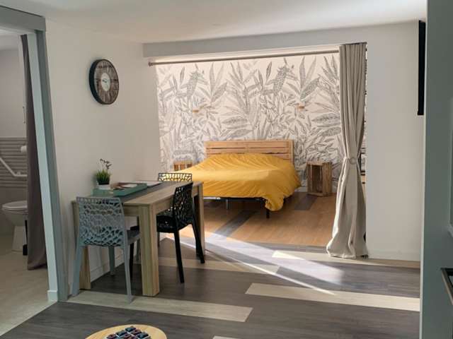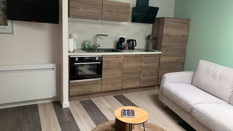 Die Ferienwohnung umfasst ein Schlafzimmer, ein Wohnzimmer und ein Badezimmer mit Dusche. Zur Ausstattung gehören ein Flachbild-TV sowie eine gut ausgestattete Küche mit Kühlschrank und Ofen. Handtücher und Bettwäsche werden bereitgestellt.